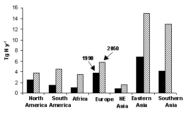 Figure 2. Predicted increases in N export to coastal systems by the year 2050. Model predictions from C. Kroeze and S. P. Seitzinger. 1998. Nitrogen inputs to rivers, estuaries and continental shelves and related nitrous oxide emissions in 1990 and 2050: A global model. Nutrient Cycling in Agroecosystems 52: 195-212. Goals of Global NEWS and Accomplishments to Date