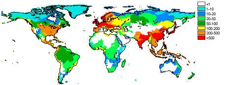 Figure 1. Nitrogen (inorganic N) export from watersheds to coastal systems. units: kg N km-2 watershed y-1. From S.P. Seitzinger and C. Kroeze 1998. Global distribution of nitrous oxide production and N inputs in freshwater and coastal marine ecosystems. Global Biogeochemical Cycles 12(1): 93-113. [pdf]